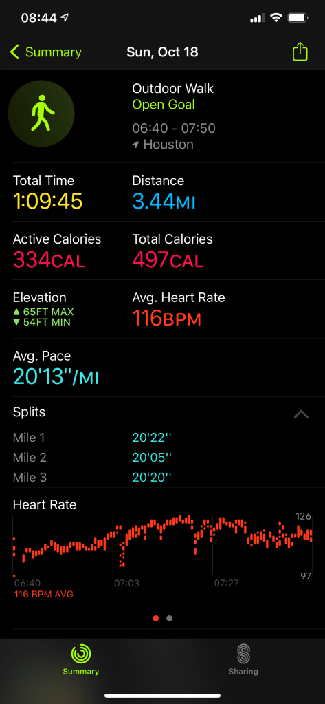 In summer sun rises super early so getting out there at 6 was great. On weekends we do 6:30am and typically walk an hour. July I did 11 walks (we started around mid July). August I doubled the number of walks and the time and distance. September I was doing great, but thanks to a little Hurricane I was sidelined for a week. 1 week turned into 3, which means I finally went back to exercising recently.